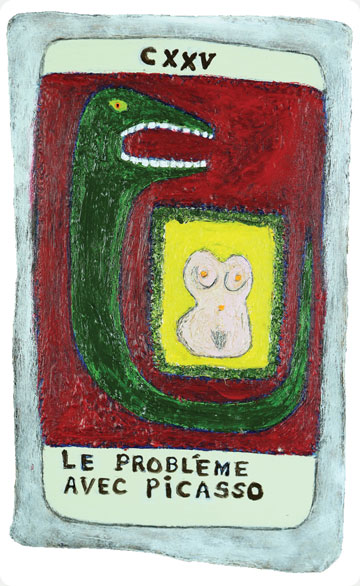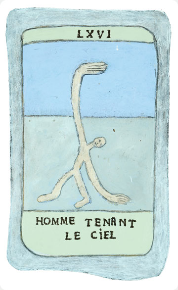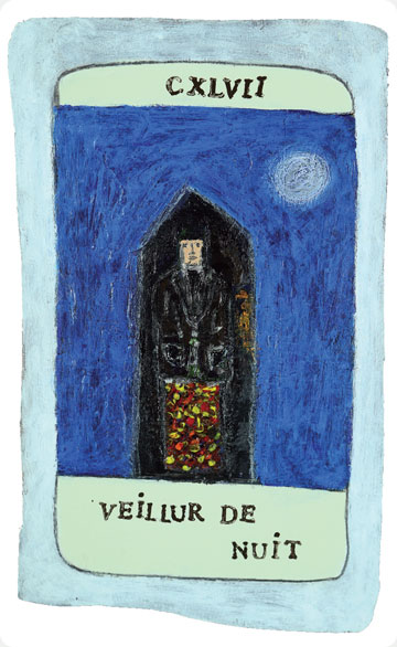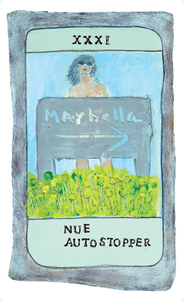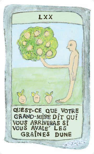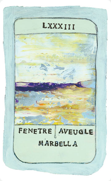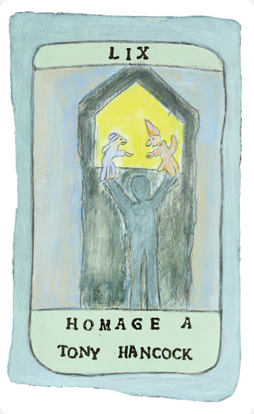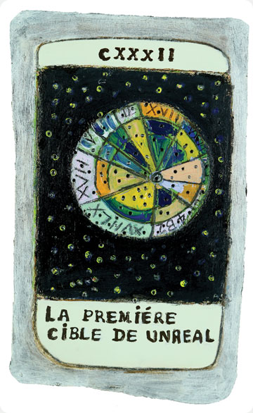 The original paintings of the studies were executed on board in medium ranging from light watercolours and acrylics to painted collage and assemblage. A French sommelier from a local restaurant translated the titles of the cards adding extra eccentricity and from over three hundred studies the final one hundred and fifty were chosen by chance. The works were spread out face down on the studio floor then handfuls of pennies were cast into the air, whatever cards pennies fell upon were removed and destroyed, the remaining one hundred and fifty were retained.